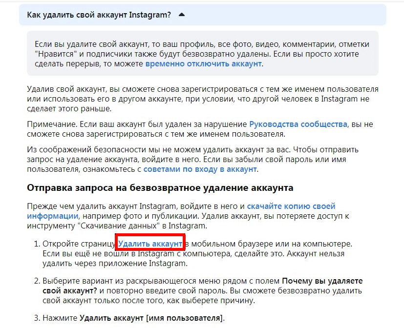 В качестве выводов рекомендуем воспользоваться временным отключением профиля, но если все же решились удалить аккаунт безвозвратно, то советуем прежде чем удалять аккаунт, войти в него и скачать копию своей информации, например фото и публикации. Удалив аккаунт навсегда, Вы потеряете доступ к инструменту “Скачивание данных”.