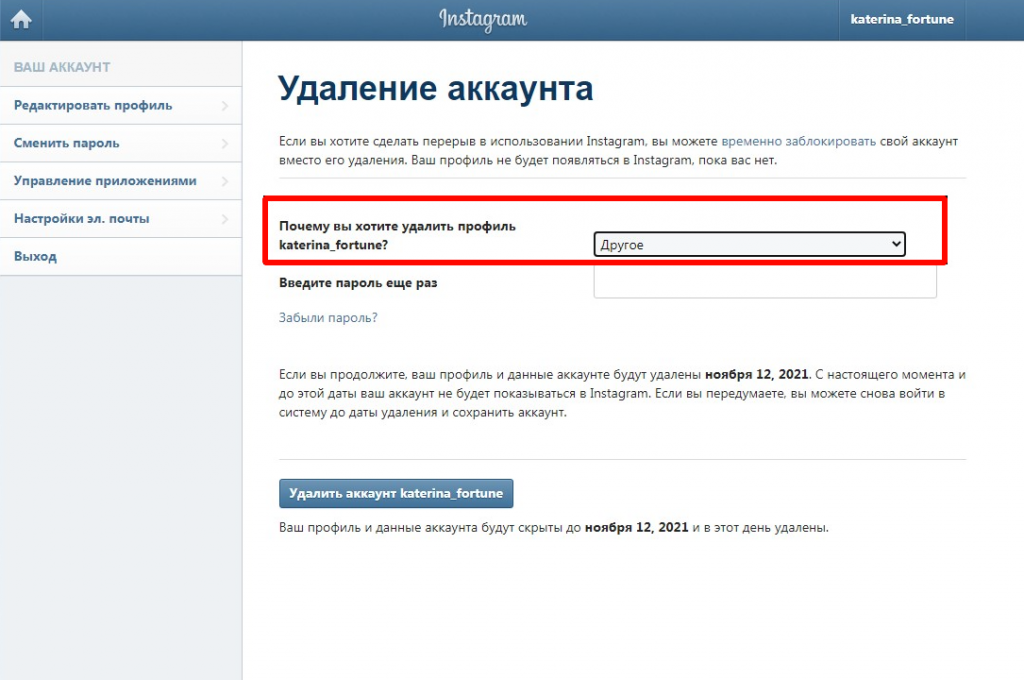 Для удаления аккаунта в Instagram выберите “Удалить аккаунт”.