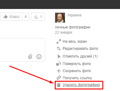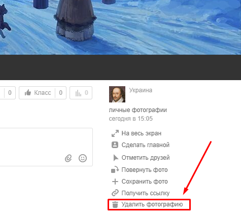 Найдите и откройте нужное фото. Справа от комментариев находится список действий, которые можно совершать. Вам необходимо щелкнуть на пункт “Удалить фотографию”.