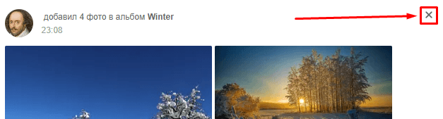 Перейдите в свой профиль и найдите тему с фотоснимками. Щелкните на крестик в правом верхнем углу публикации, и она навсегда исчезнет. Аналогичным образом можно скрыть изображения из ленты новостей – найти снимки в новостной ленте и кликнуть на крестик.