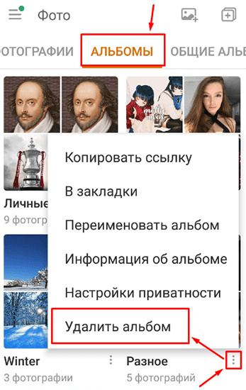 Чтобы убрать несколько картинок из фотоальбома, придется перейти на вкладку “Альбомы”. После этого выбрать тот, который вам не нужен, и нажать на уже знакомые вам 3 вертикальные точки. В появившемся окошке тапнуть на пункт “Удалить альбом”, после чего подтвердить ваши намерения.