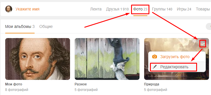 В интерфейсе тоже минимум отличий. Разве что для перехода в режим редактирования альбома придется кликнуть на надпись “Редактировать, изменить порядок”, а не просто “Редактировать”, как это было на личной страничке.