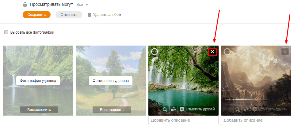 В режиме редактирования появляется несколько интересных возможностей вроде перемещения и переворачивания изображений. Но нам интересен только крестик, который расположен на каждой миниатюре в правом верхнем углу. Если на него нажать, то фотоснимок сразу будет удален, а вы увидите соответствующее уведомление и кнопку для восстановления. После обновления страницы восстановить удаленные фотоснимки будет уже невозможно.