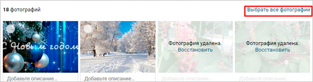 Чтобы очистить этот подраздел, жмем на пиктограмму в виде карандаша и затем на надпись в верхнем правом углу, чтобы отметить все фото.