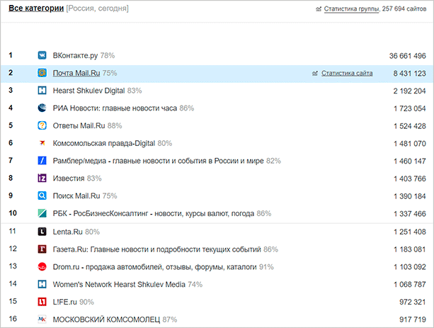 Давайте более подробно остановимся на рейтинге сайтов LiveInternet. Он представляет собой рейтинг всех ресурсов, которые добавлены в сервис. Места распределены по суточной посещаемости – от большой к маленькой.