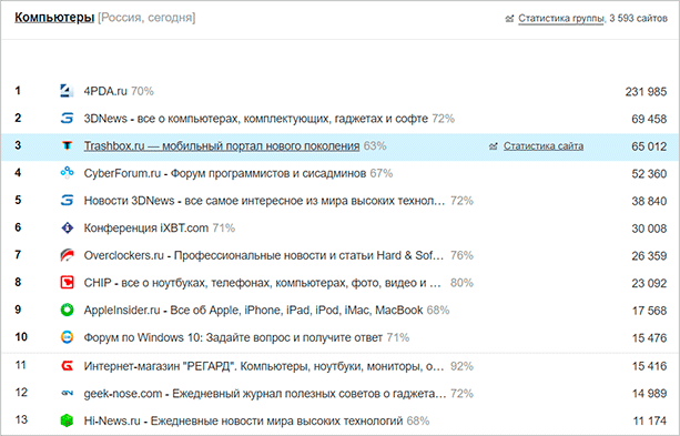 Топ-10 занят крупными порталами, социальными и другими ресурсами. Суточная посещаемость в несколько миллионов впечатляет. Обычному статейнику в РФ очень сложно добраться до таких высот. Но это общий рейтинг. Тематический скромнее.