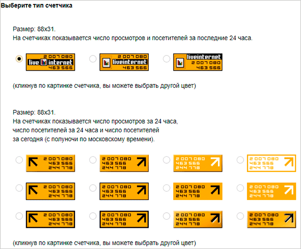 Здесь можно выбрать тип счетчика, цвет (если кликнуть на картинку). На всех показывается статистика. Это можно отключить в настройках. Но об этом позже, а сейчас нам интересен следующий момент.