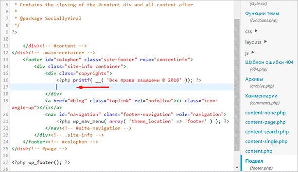Вставляем в любое удобное место. Но учтите: если попадете не туда, этот информер испортит вам весь дизайн. Лучшее место, по моему мнению, это где-то рядом с копирайтом: “Все права защищены 2018” или что-то подобное. Вставляем скрипт, сохраняем изменения. Не забудьте зайти на главную страницу, чтобы посмотреть не набедокурили ли вы.