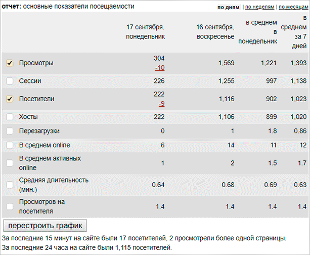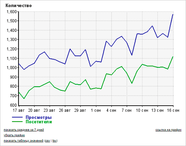Чуть ниже данные представлены уже в виде графика. По умолчанию видно только количество просмотров и посетителей.