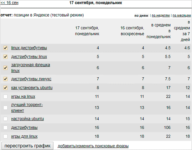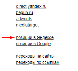 Выделил эту фишку отдельно, т. к. это действительно очень важный инструмент, который помогает понять, на каких позициях и по каким запросам сейчас ваш проект находится в Яндексе и Гугле. Для перехода найдите и выберите в левой колонке фразу “позиции в Яндексе”.