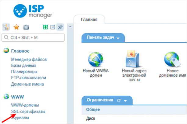 Чтобы установить ССЛ в ISPmanager 4, вам нужно перейти в панель управления и в соответствующий раздел. Он имеет название SSL-сертификаты.