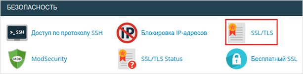 Для подключения SSL на хостинге Cpanel нужно перейти в соответствующий раздел на вашей панели управления. Он находится во вкладке “Безопасность”.