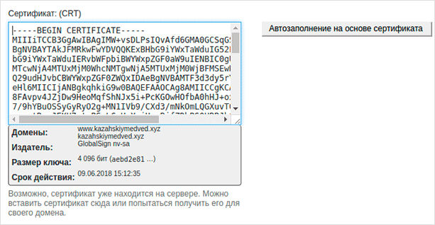 Вводим данные сертификата (после BEGIN CERTIFICATE). Заканчивается на END CERTIFICATE. Далее вставляем закрытый ключ и цепочку сертификатов.