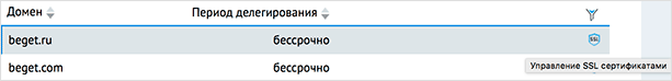 Для установки защищенного протокола на хостинге Beget перейдите в раздел “Домены и поддомены”, после чего нажмите на кнопку “Управление SSL-сертификатами”. Она будет напротив нужного домена.