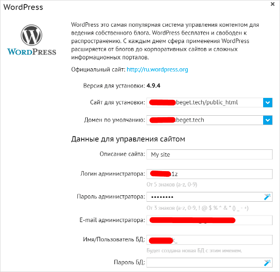 Обратите внимание, что у Beget имя базы данных и имя пользователя совпадают. Не упустите этот момент при установке.