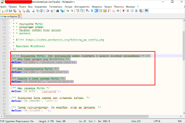 Теперь мы снова переходим в папку с WordPress на нашем компьютере. На этот раз нам придется немного подправить файлик. Он имеет название: wp-config-sample.php. Но перед редактированием и последующей загрузкой мы должны переименовать его в wp-config.php. Это обязательно!