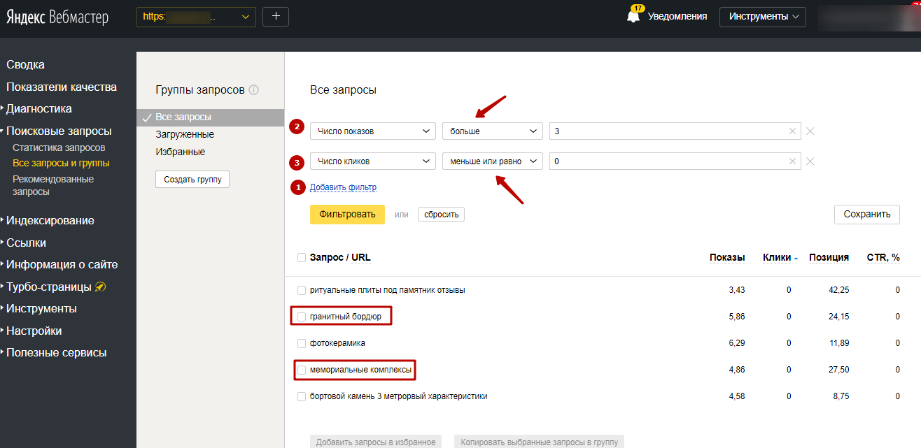 Собрать упущенную семантику поможет Яндекс.Вебмастер. Заходим в Поисковые запросы — Все запросы и группы. Тут будут последние запросы, по которым показывался сайт, видно количество переходов, среднюю позицию и CTR. Отфильтровываем те запросы, по которым были показы, но не было переходов.