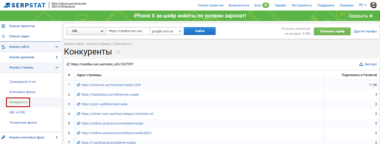 Здесь будет список конкурирующих с вашим URL. Выберите один конкретный и нажмите на него – получите список ключей, по которым он продвигается.