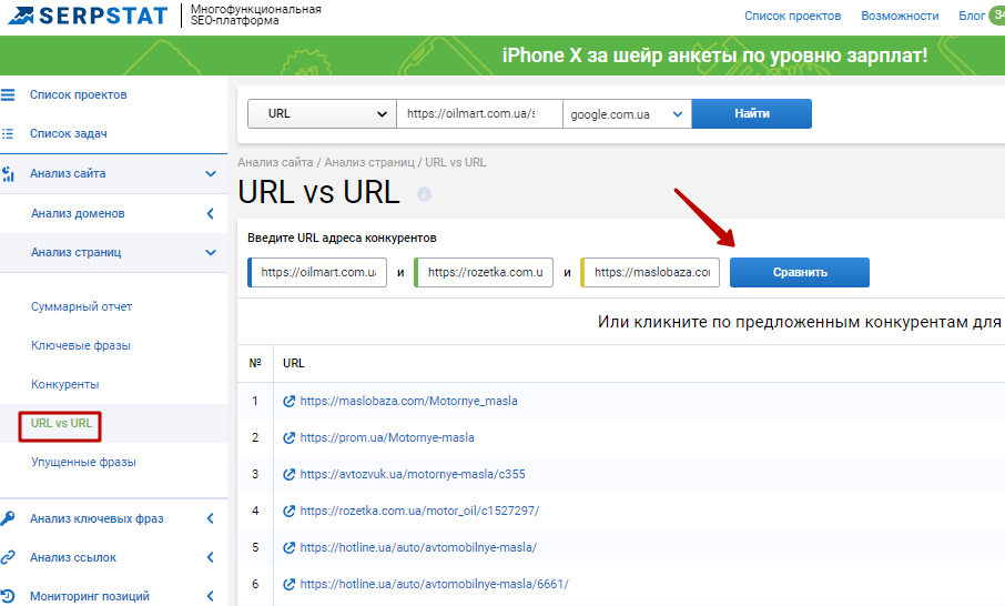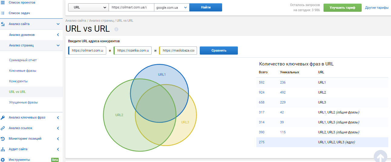 Сравните свое ядро с ядрами двух конкурентов, чтобы изучить, в чём секрет их успеха. Для этого заходим в модуль «URL vs URL» и выбираем двух конкурентов из списка ниже. Нажимаем «Сравнить»: