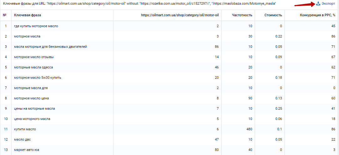 Для дальнейшего анализа экспортируем ключевые слова – нажимаем «Экспорт» и выбираем удобный формат.
