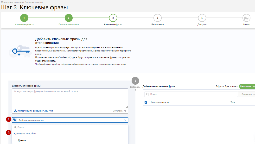 Чтобы начать мониторинг, добавляем свой проект в Serpstat и настраиваем отслеживание. На третьем этапе настроек – «Ключевые фразы» — задаем тег для группы ключевых слов.