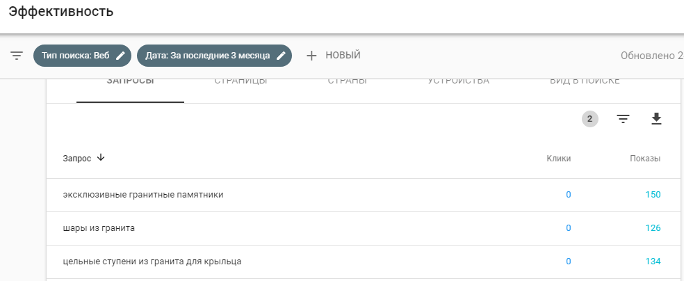 Также вы можете использовать сервисы Google. Найти упущенную семантику поможет Search Console. В отчёте по эффективности будет список поисковых запросов, по которым показывался сайт. Здесь тоже можно задать фильтры – 0 кликов и, например, больше 100 показов: