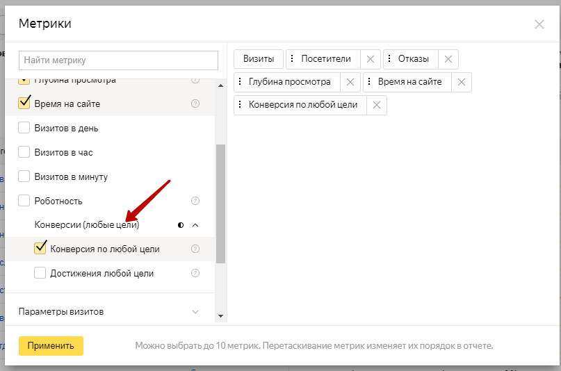 Задаем период отчета, например, за месяц. Затем настраиваем Метрики – Конверсия по любой цели.