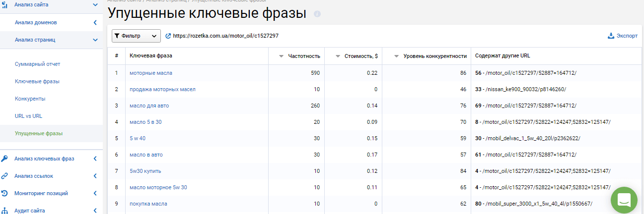 Заходим в инструмент Анализ страницы — Упущенные фразы. Спустя несколько секунд получаем список ключевых слов, которые используют конкуренты из топ-10, но которых нет у нас.