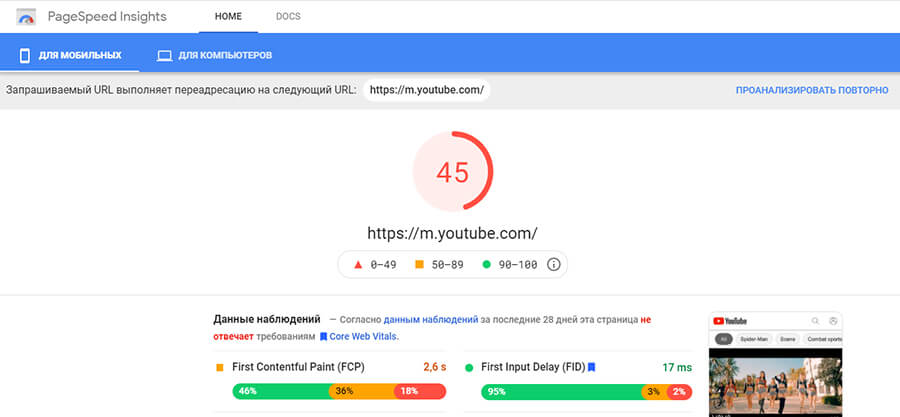 Если скорость выше 3 секунд, нужно принимать меры. Хотя…низкая скорость еще не означает, что все пропало. Проанализировав несколько крупных сайтов с высокой посещаемостью, мы обнаружили, что некоторые страницы набирают до 49 баллов по Google PageSpeed Insights (это низкий показатель). Тот же YouTube не вписывается в параметры быстрого сайта — у него всего 45 баллов, а у Vimeo 65 баллов. У Amazon также низкая скорость для мобильных. Но эти ресурсы популярны и для пользователей их скорость не так критична, как в случае с новым малоизвестным сайтом. Если страница грузится уже 6-10 секунд, пользователь может подумать, что у него проблемы с интернетом и уйдет с сайта (или просто не захочет ждать).