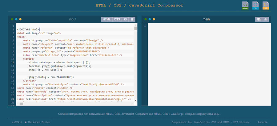 — Через компрессоры кода. Принцип работы — вы загружаете код на страницу сервиса, а он выдает измененный сжатый код. Его нужно скопировать и вставить вместо изначального. Пример такого сервиса — compressor.andona.click. Сжимает HTML, CSS и JavaScript код.