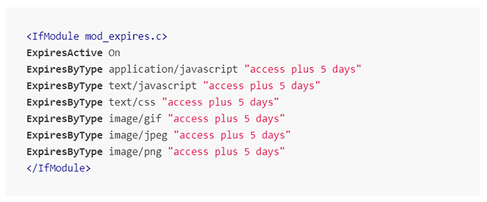Красным указывается количество дней кэширования для отдельных элементов (текста, кода, картинок). Вместо дней можно указать часы, месяцы, недели, годы. В зависимости от типа заголовков (Expires, Cache-Control, Last-Modified, ETag), данных для кэширования и продолжительности хранения кэша код будет отличаться. Поэтому с этим тоже лучше обращаться к программистам.