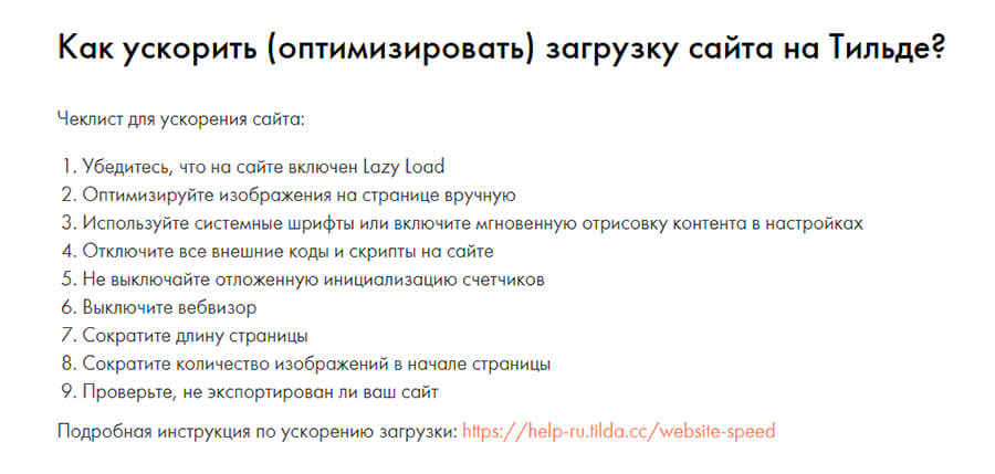 В таком случае нужно заранее выбирать конструктор с возможностью оптимизации. Например, на Тильде можно включить постепенную загрузку изображений, мгновенную отрисовку контента, вручную оптимизировать изображения, подключиться к CDN.