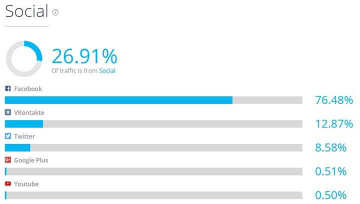 Также сервис предоставляет информацию о трафике из социальных платформ: из каких социальных сетей идут посетители, и какая доля трафика выпадает на каждую из них.