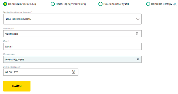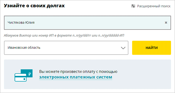 Если вы не уверены в наличии за вами долгов, проверьте самостоятельно на сайте ФССП по своей фамилии. Это можно сделать и по любому другому человеку, по которому вы хотите узнать информацию.