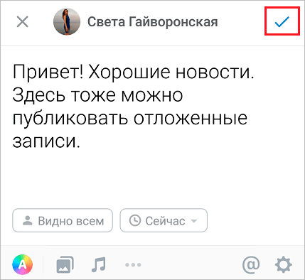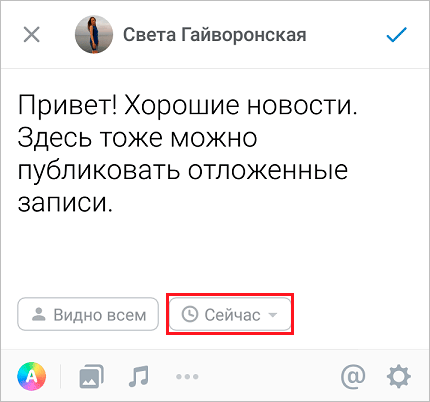 Заходим в программу через телефон или планшет, идем в свой профиль или группу, где планируем разместить запись. Набираем текст сообщения, прикрепляем файл, добавляем фото или видео. В общем, подготавливаем новость. Затем нажимаем на слово «Сейчас» и выбираем дату и время публикации.
