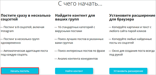 Это продукт, с которого стоит начать новичкам, чтобы оценить возможности и удобство работы, экономию времени. На сайте предоставляется 14 дней тестового бесплатного пользования. Постить записи можно сразу в 8 социальных сетей.