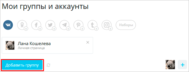 В своем личном кабинете можно подключить другие социальные сети Одноклассники, Facebook, Instagram, Twitter, Telegram, Pinterest, Tumblr. Сразу после авторизации через ВКонтакте становится доступен постинг новостей на личной странице. Можно также добавить группы, в которых вы планируете размещать записи.