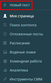 Слева в кабинете есть основное меню. Нас сейчас интересует создание отложенного поста.