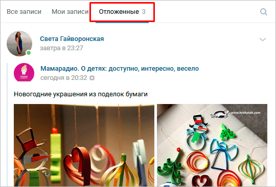 Если вы хотите просмотреть уже запланированные записи, то выберите в меню слева пункт «Отложенные посты».