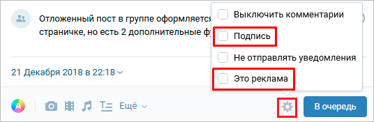 В группе ВКонтакте все делается точно так же, никаких отличий от публикации на личной страничке нет, кроме возможности сделать подпись и отметить рекламные сообщения.