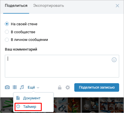 В появившемся окне настраиваем параметры поста, жмем на слово «Еще» и выставляем время на таймере.