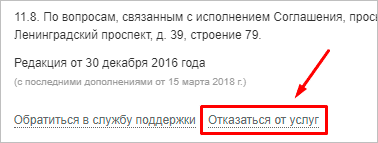 На странице с регламентом вы наткнетесь на огромное полотно текста. Читать его точно не захочется, да это и не нужно. Просто пролистайте текст до конца. В нижней части окна вы найдете кнопку “Отказаться от услуг”. Кликните на нее.