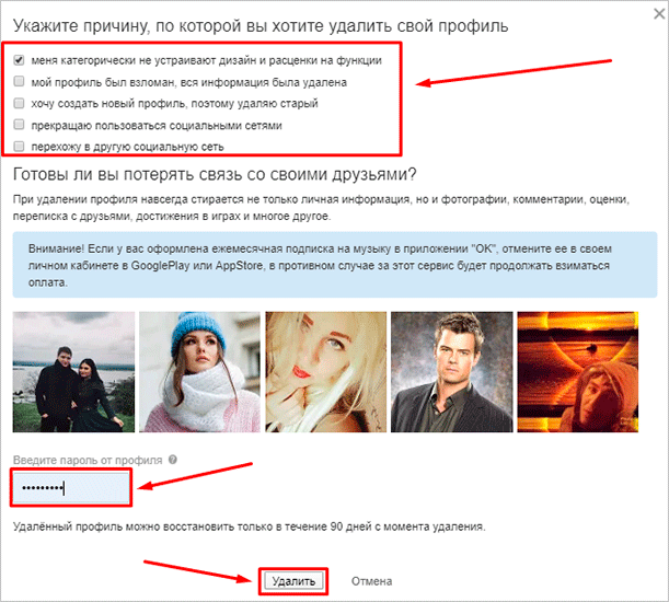 Теперь перед вами должно появиться окно удаления профиля. В нем необходимо указать причину, по которой вы решили уйти из Одноклассников, ввести пароль от аккаунта и нажать кнопку “Удалить”.