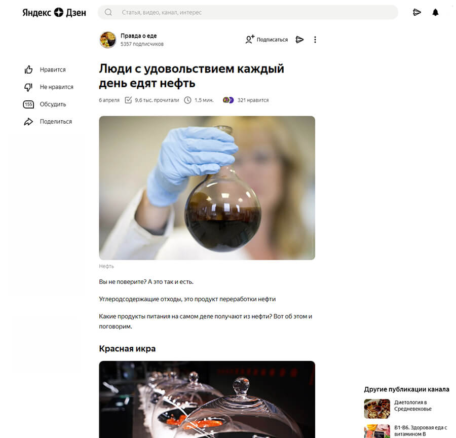 Пример удачного канала — «Правда о еде». Автор описывает интересные факты, связанные с пищей. Да такие, о которых вы не задумывались. Например, какую еду делают из нефти, в чем состояла диета Средневековья, какая связь между долгожительством и куриными мозгами.