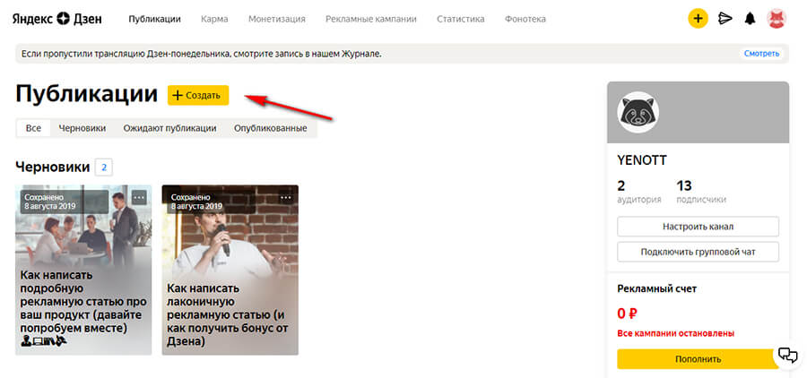 Шаг 1. Заходим на главную Дзена (где вход для авторов), нажимаем «+Создать».