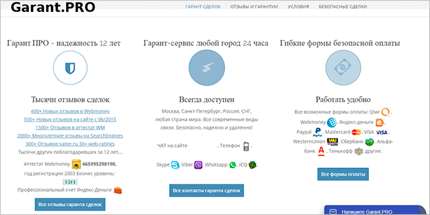 На нашей памяти был случай, когда из трех участников мошенником оказался именно гарант. После получения денег он просто исчез. Поэтому пользуйтесь услугами только проверенных и надежных сервисов. Нейтральным вариантом является Garant.PRO. Его знают все, кто хоть раз совершал сделки в сети. За время работы этот сервис заработал себе безупречную репутацию.