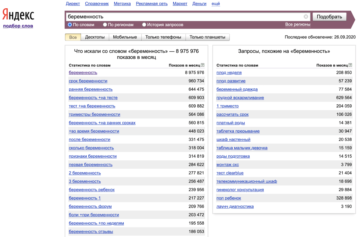 Как видно на скриншоте, запросов со словом беременность вводят в поиск ежемесячно более 8 миллионов раз. Здесь нужно понимать, что люди могут вводить запросы по-другому, используя похожие слова, например “беременные”.