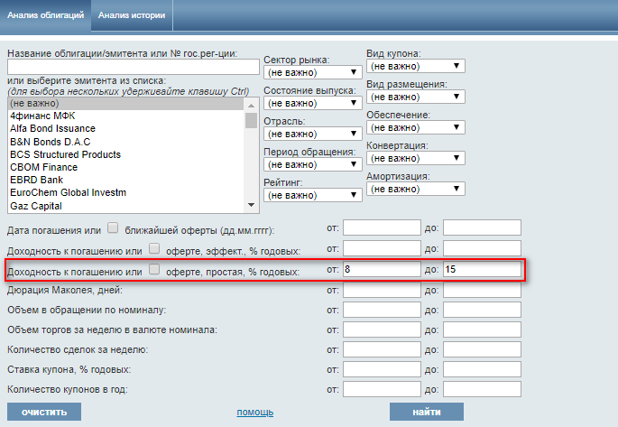 На сайте rusbonds.ru можно сразу организовать поиск по доходности, указав необходимые параметры в фильтре.