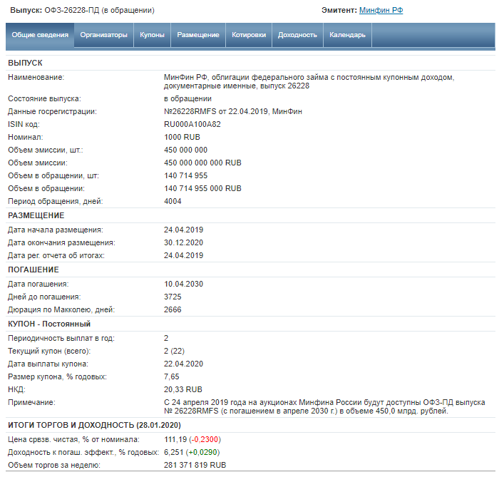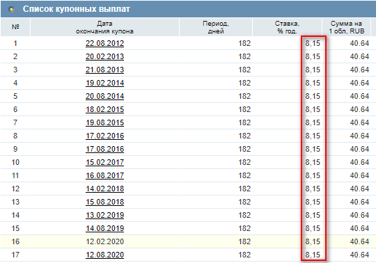 - Постоянный купон. Известен заранее на весь срок жизни долговой бумаги. Инвестор может заранее рассчитать прибыль. На сайте rusbonds.ru в карточке конкретной облигации с постоянным купоном его размер выглядит так: