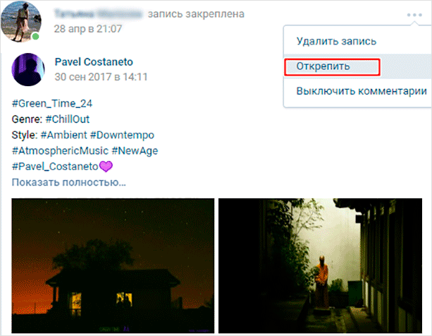 Также наглядно разберем, как открепить пост, чтобы он встроился в ленту в соответствии с хронологическим порядком.